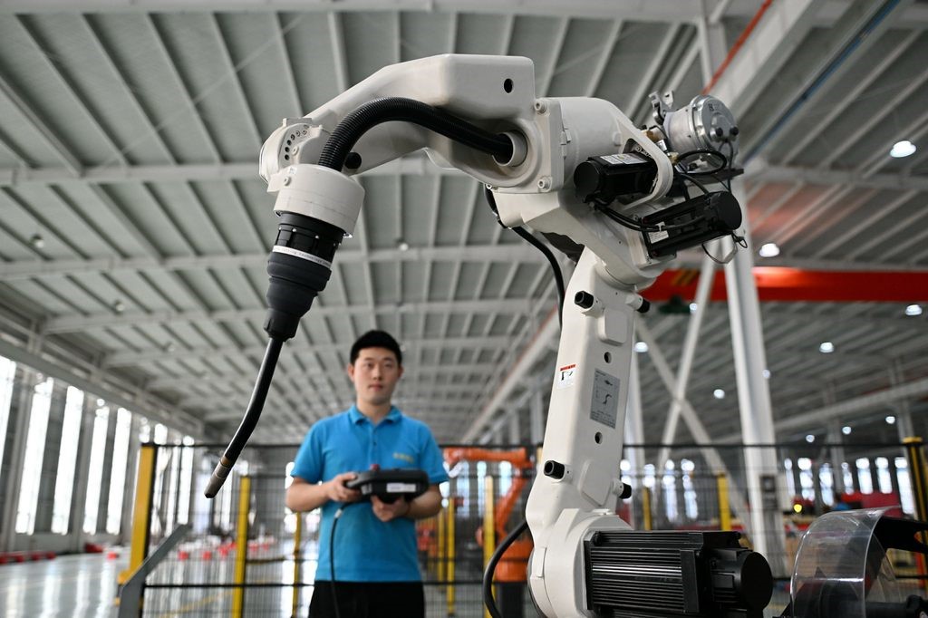 工人在位于任丘市的金獅智能機(jī)器人有限公司生產(chǎn)車間內(nèi)調(diào)試產(chǎn)品。新華社資料片