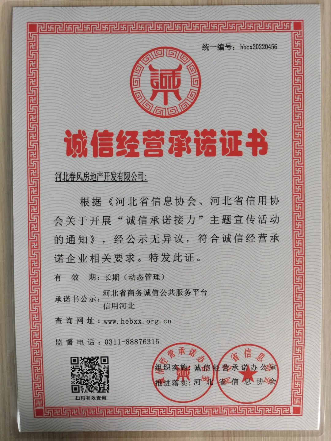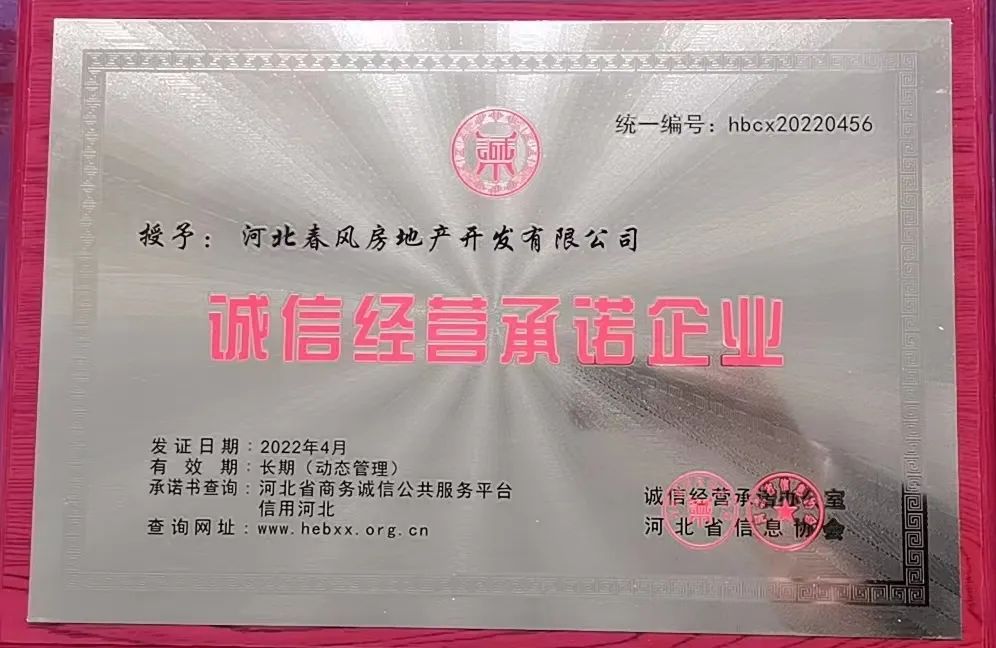 春風(fēng)集團(tuán)房地產(chǎn)公司榮獲誠信經(jīng)營承諾企業(yè)稱號(hào)