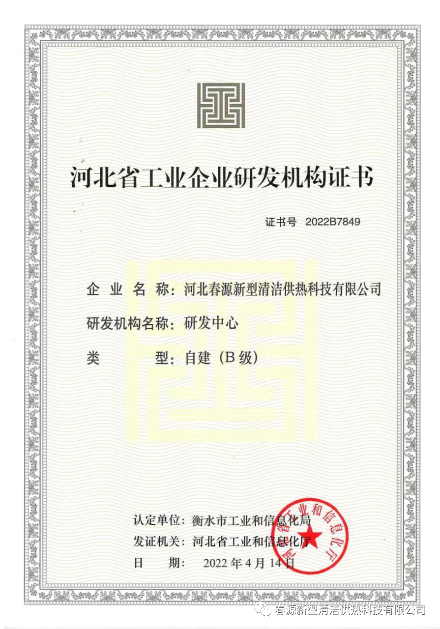 近日,河北省工業(yè)和信息化廳為河北春源新型清潔供熱科技有限公司研發(fā)中心頒發(fā)了河北省工業(yè)企業(yè)研發(fā)機構(gòu)證書。按照河北省政府《關(guān)于支持企業(yè)技術(shù)創(chuàng)新的指導意見》要求,企業(yè)是否建立研發(fā)機構(gòu)是認定高新技術(shù)企業(yè)、科技小巨人企業(yè)、“專精特新”中小企業(yè)的重要條件,是企業(yè)研發(fā)和技改項目申請政府幫扶的重要平臺,對推動企業(yè)高質(zhì)量發(fā)展具有十分重要的意義。此次認證,充分體現(xiàn)了省、市相關(guān)單位對我公司研發(fā)能力的高度認可,為春源清潔供熱影響力的提升奠定了基礎(chǔ)。